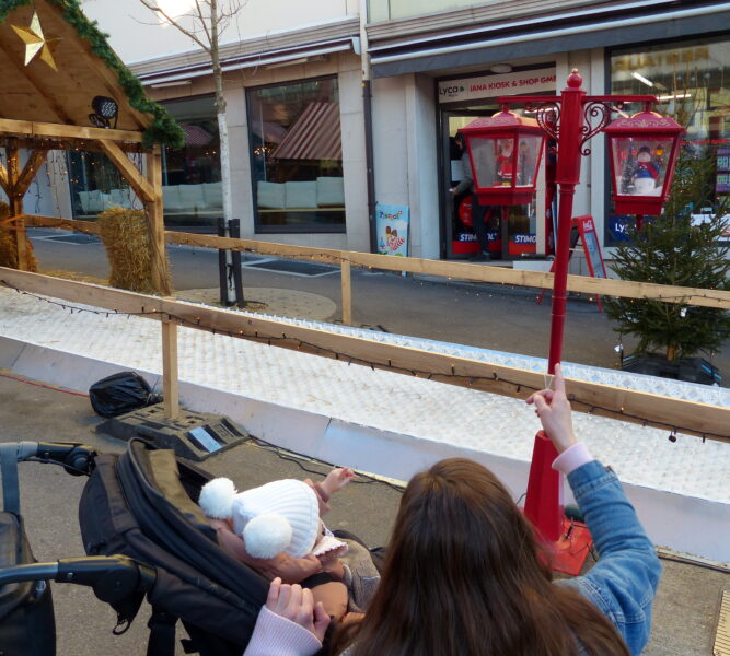 des Kindes folgen dem Zeigefinger der Mama und schauen gebannt auf die beiden Adventslaternen:
