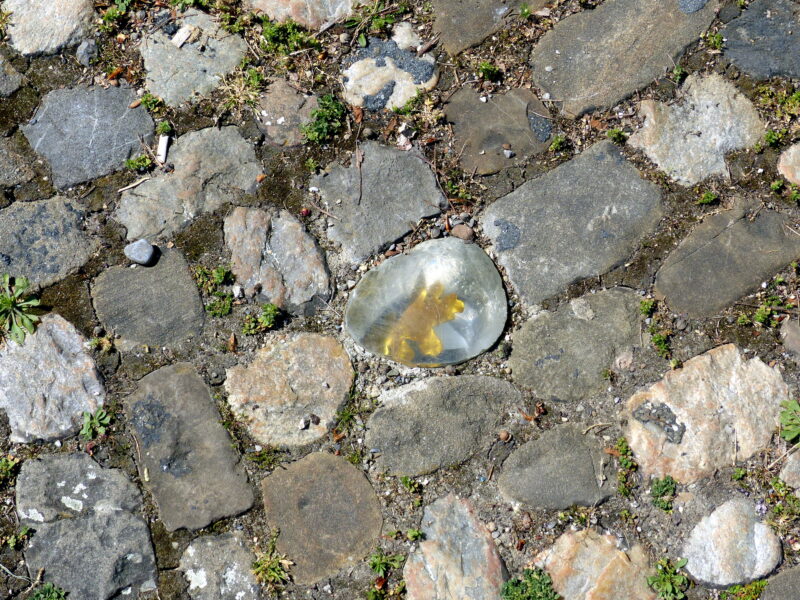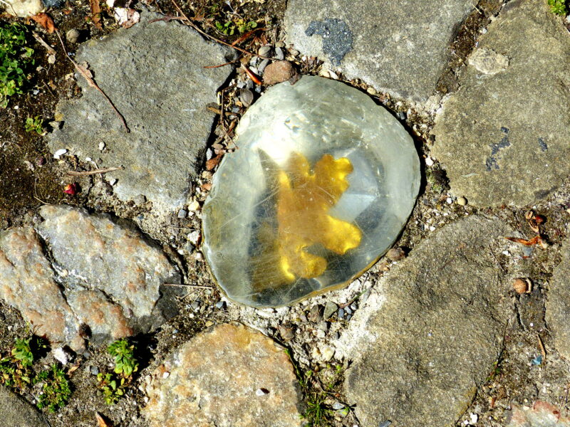 „Künstlerische Intervention“ von Beat Breitenstein vor dem Kunsthaus Zofingen. Dort wurden auf dem Vorplatz fünf Kopfsteinpflastersteine mit je einem in Harz gegossenen goldenen Eichenblatt ersetzt. Diese Eichenblätter stammen von der dreissigjährigen Eiche, im Jahr 2020 im Rosengarten neben dem Kunsthaus gepflanzt wurde.