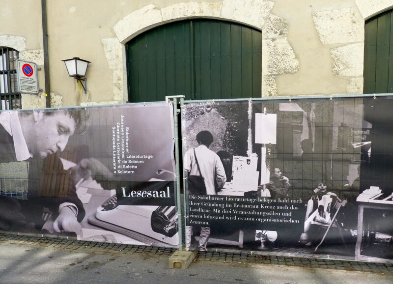 Foto Brigitte Fuchs: Absperrung mit Fotoplanen vor dem „Landhaus“, dem Zentrum der jährlich stattfindenden „Solothurner Literaturtage“. Links im Bild der junge Autor Peter Bichsel