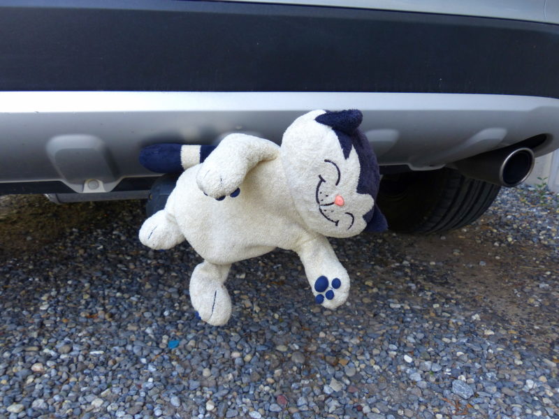 Was für eine niedliche Mieze. Wie lange mag die noch an der Anhängerkupplung hängen? Sie sieht tarsächlich aus, als wäre sie leicht berauscht. *bg*