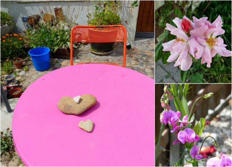 Oh wie schön, ich mag mobile und flexible Kübelgärten. Besonders schön sind aber auch die Stein-Herzen auf dem Tisch.