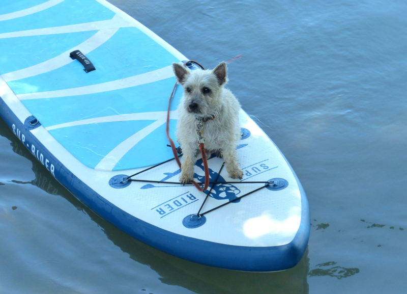 Der arme Kerl. Er scheint zu denken: Wir hätten so schön auf der Wiese tollen können, Stöckchen fangen, andere Hunde treffen. Aber nein: Wassersport.