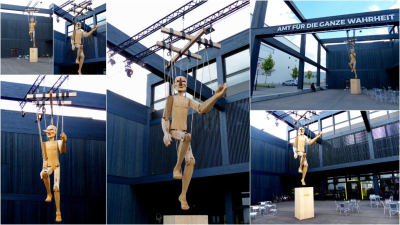 Die Holzfigur trägt den Namen „Pinokio“. Sie wurde 2018 aus Fichtenholz geschaffen vom Schweizer Künstler Roman Sonderegger, *1979